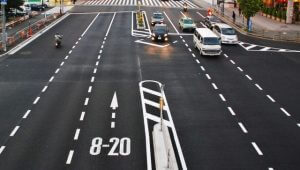 上記の画像の様な片側3車線以上の道路や一方通行で3車線以上の道路は標識が無くても二段階右折をしなければいけません。