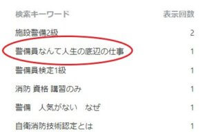 そして…はい!来ました!「警備員なんて人生の底辺の仕事」という検索ワード!「底辺」系の検索ワードはめちゃ多いですが、その中でも一番実感がこもっていた検索ワードです。