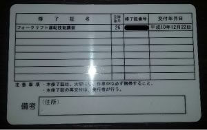 資格というか免許になりますが「フォークリフト運転技能講習修了証」です。ただ交付年月日を見てみると取得したのが平成10年12月22日となっており、今から20年前…という事になります(笑)