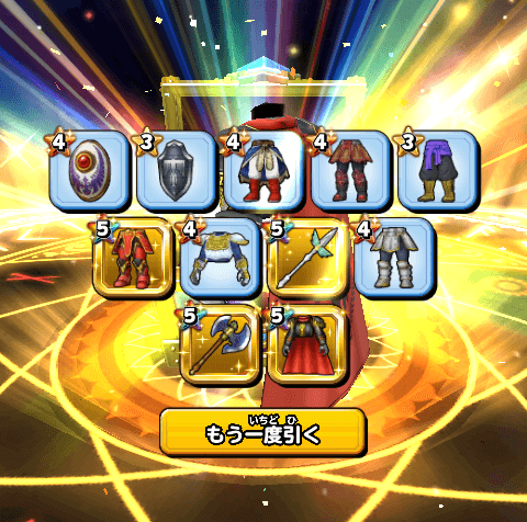 気を取り直して3発目…!☆5装備がなんと4つも排出!…嬉しいけど、しかしながら目玉装備は排出されず「焔龍神のよろい下」「大天使のやり」「まじんのオノ」「鬼神の鎧上」が出ました!
