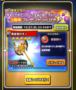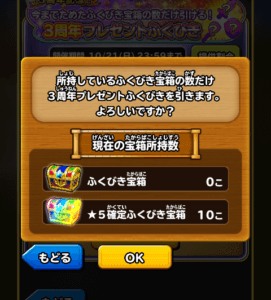 3周年記念福引きとは…なんぞや?という方に説明すると、9/13(木)から始まったイベントで、およそ1か月間毎日1クエストずつ特別イベントクエストをやっていくと宝箱ポイントが溜まっていき、最終的に3周年当日に☆5確定宝箱が10個引けるというものでした♪