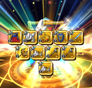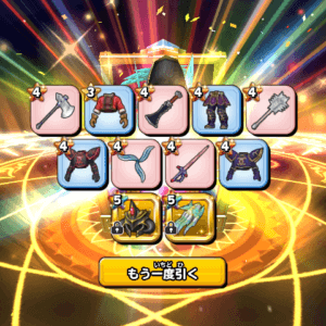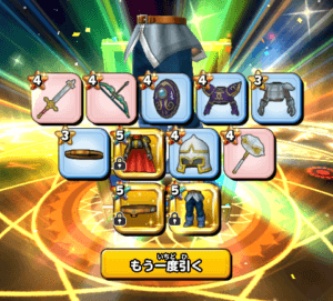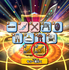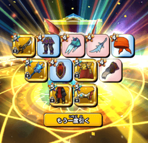 ちなみに出たのは「ロトの鎧」、「メタスラヘルム」、「黄金竜の槌」、「ロトの盾」「王者の剣」、「黄金竜の斧」、「メタスラの冠」x2、「メタスラの杖」x2でした。