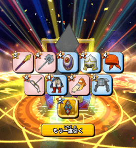 まぁ土日に1回ずつと2回しかチャンスがないので…狙うべきも何もないんですが、欲しいものと言えばやはり「聖王の剣」「聖王のハンマー」あたりが欲しいですね。