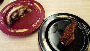 もう脂が乗ってて最高に美味いです!!…ちなみに赤い皿が150円、黒い皿が300円になってます(笑)